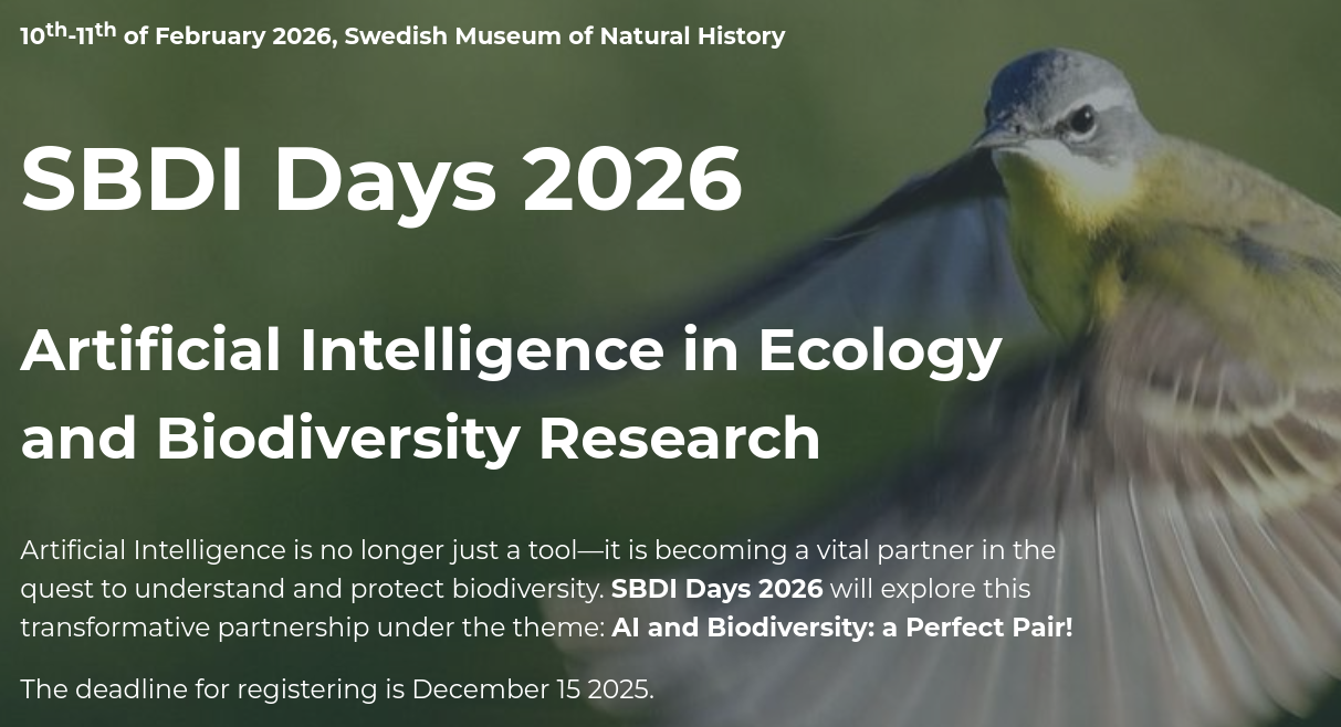 | • | 2026-02-10: SBDI Days 2026: Artificial Intelligence in Ecology and Biodiversity Research (Read more) | ![]() |